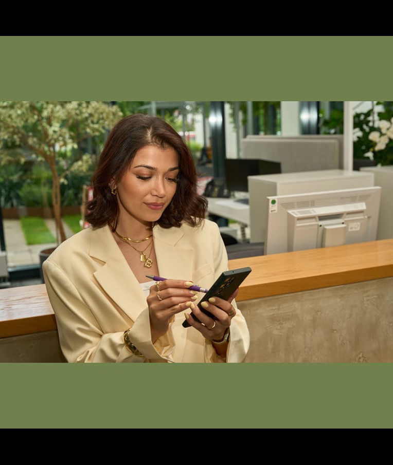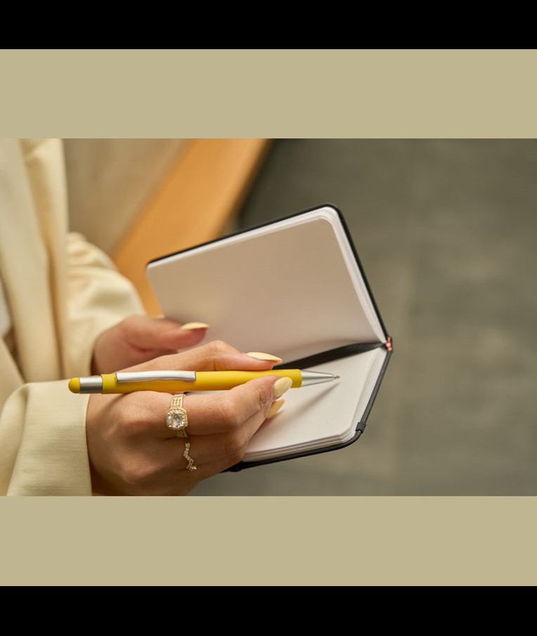 Retractable metal ballpen featuring a touch function, a coloured rubberised shaft, and a blue-ink refill.