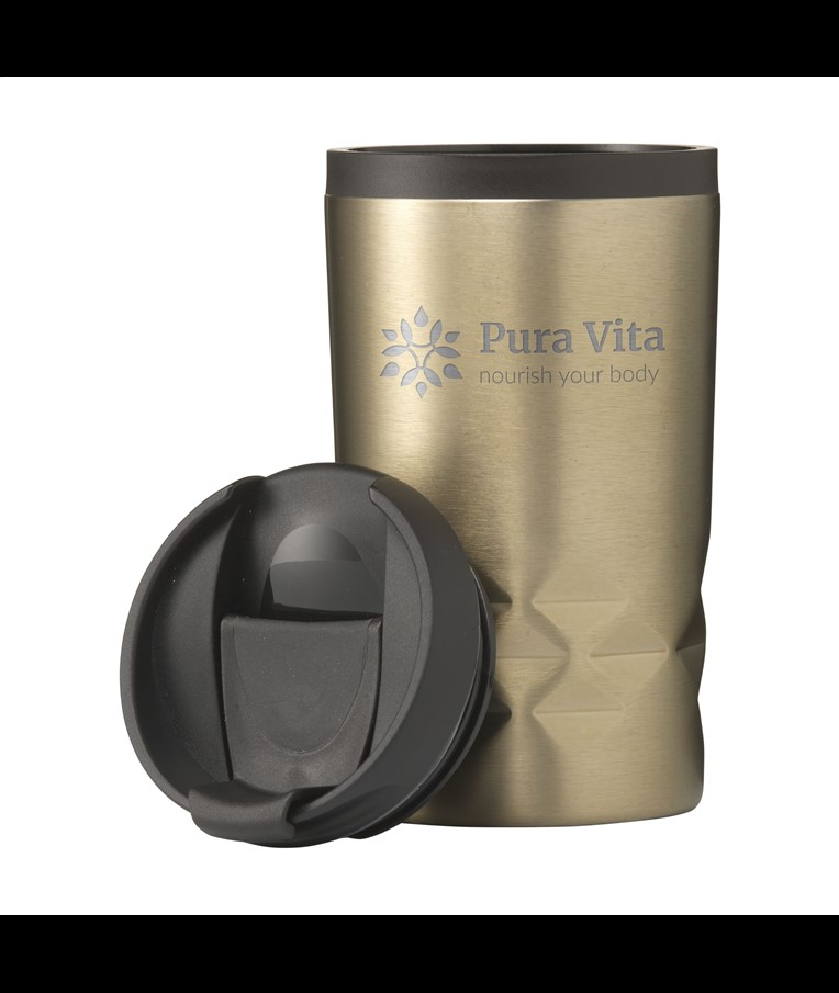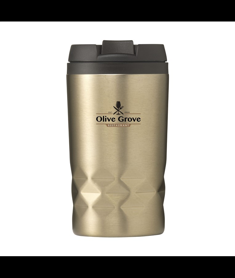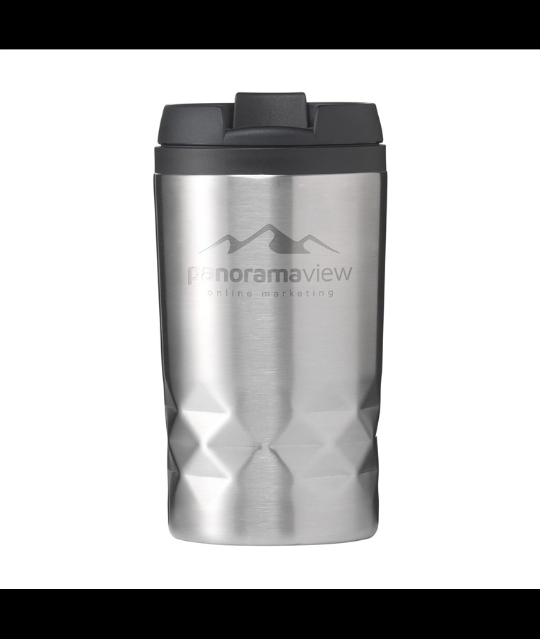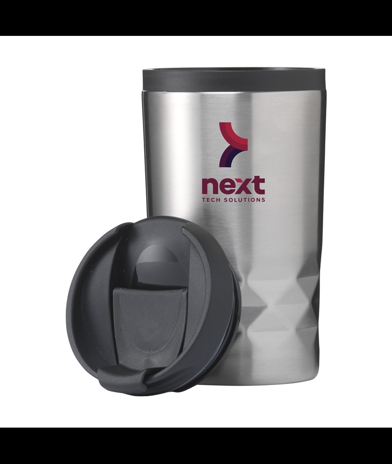 WoW! Double-walled, leakproof thermos cup made from recycled stainless steel. With a plastic inner wall, screw lid and click-opening. This cup has a striking 3D geometric diamond pattern. Non-slip bottom. Not dishwasher-safe. Without lid, the mug has a height of 12.4 cm and thus fits under almost all coffee machines. RCS-certificated. Total recycled material: 42%. Capacity 250 ml. Stainless steel can be recycled many times whilst retaining the quality of the material. By using recycled stainless steel, fewer new raw materials are needed. This means less energy consumption and less use of water. Packed individually.