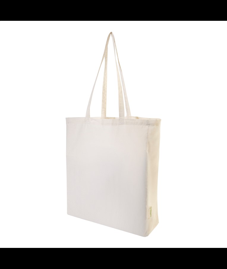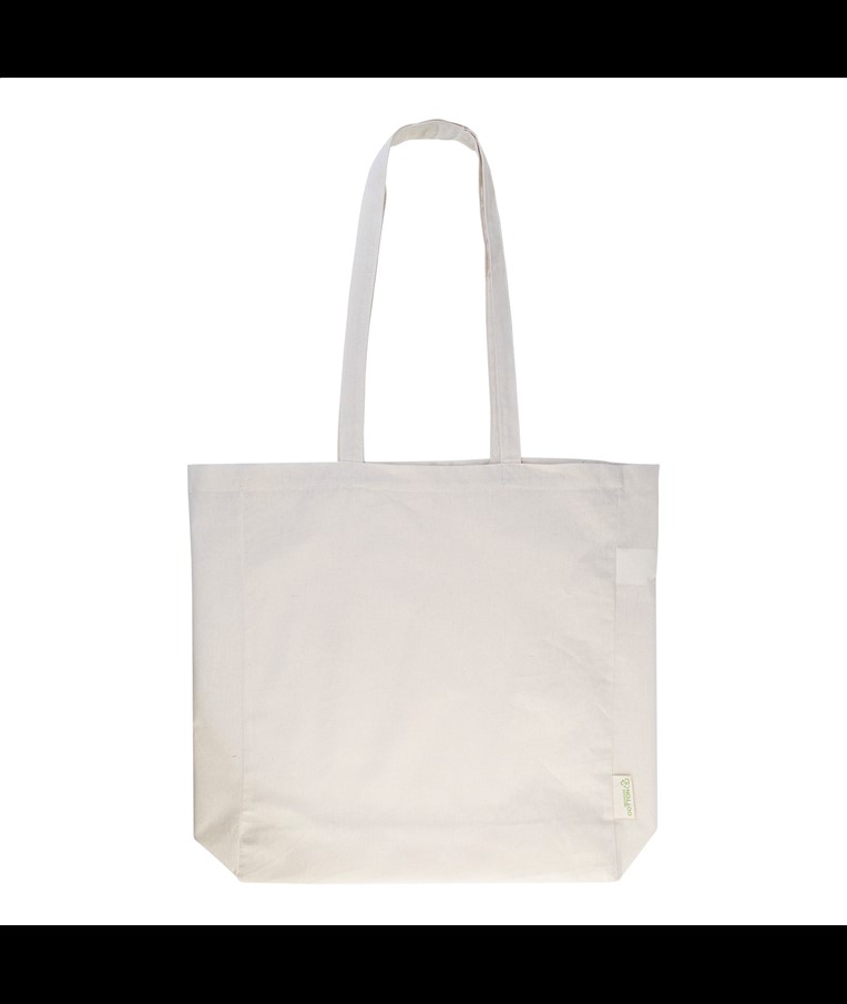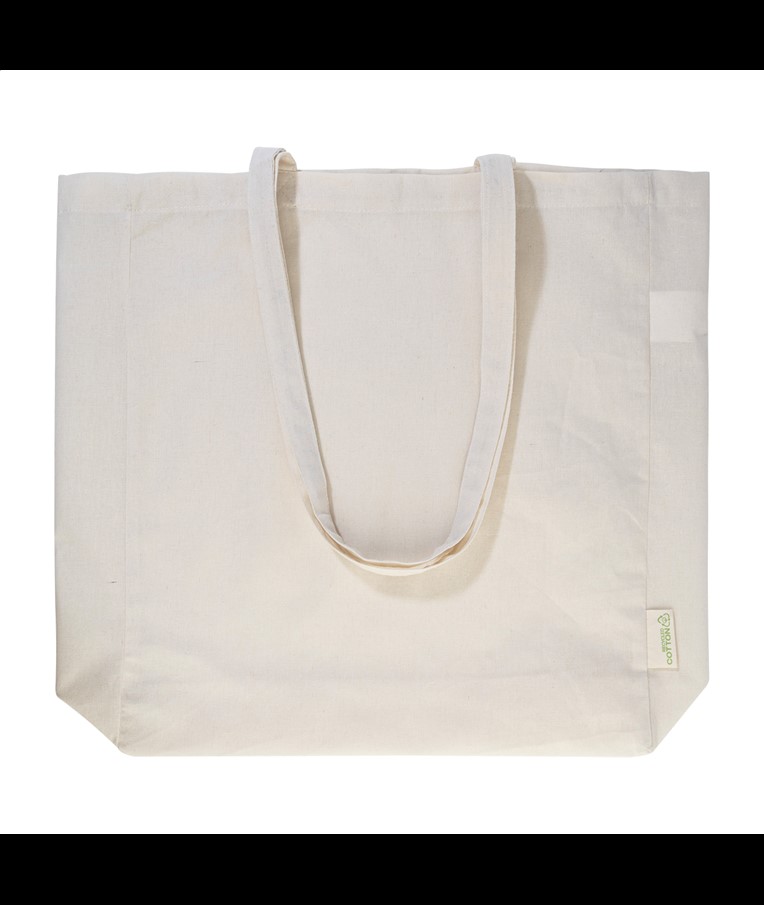 Shopping bag with gusset and long handles in 70% recycled cotton and 30% RPET polyester, 140 g/m². With distinctive recycled cotton label.