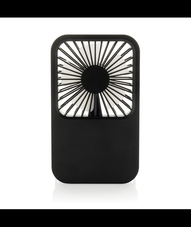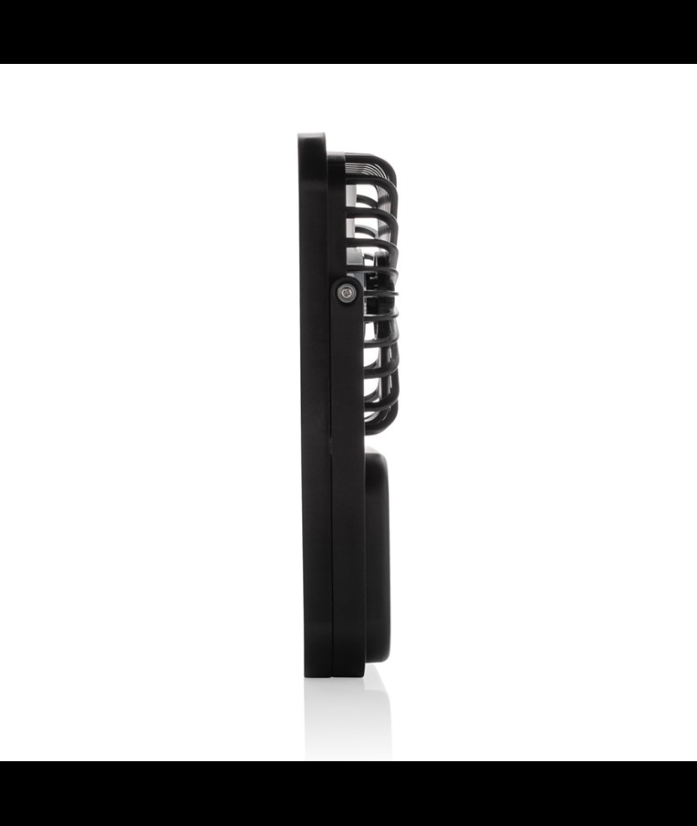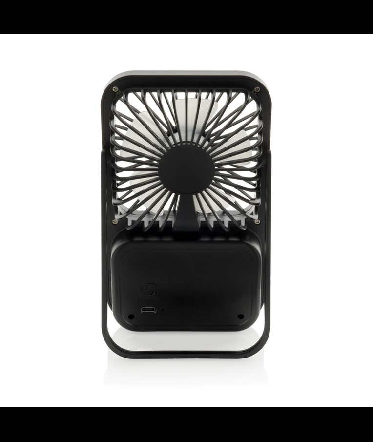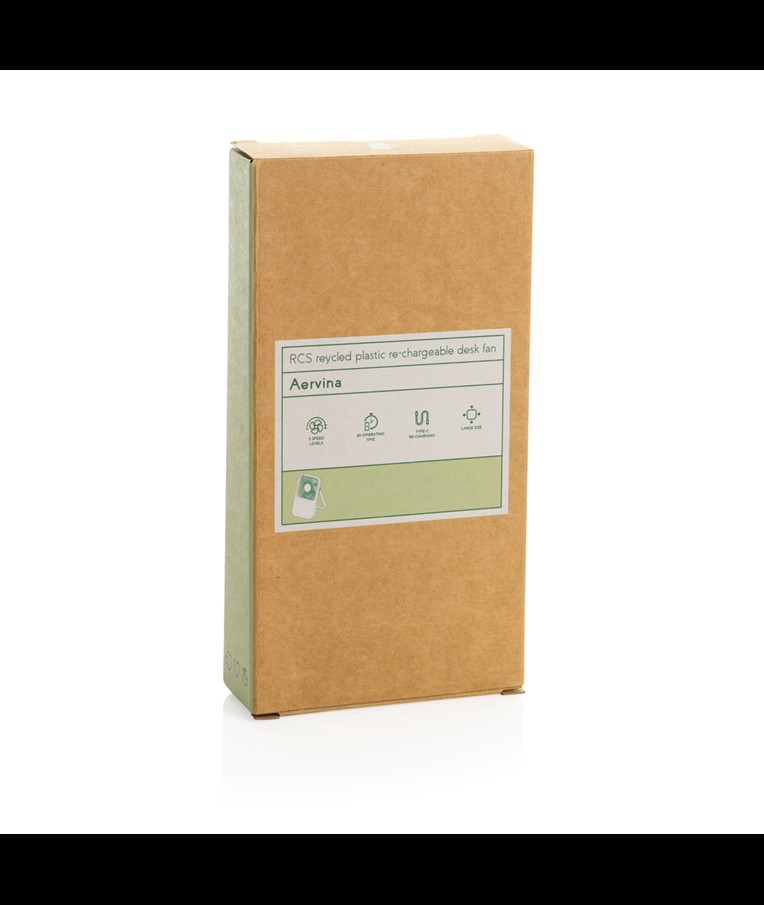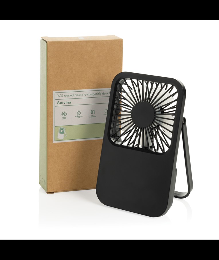The Aervina desk fan, made from RCS certified recycled plastic, is a sleek and practical way to enjoy a refreshing breeze at home or in the office. Its modern black design combines style with function. The rechargeable 1200 mAh Li-ion battery provides up to 3 hours of working time and recharging in 4 hours via the included 120 cm black TPE USB-A to USB-C cable. With three adjustable speed levels and an adjustable stand, the Aervina fan offers flexible comfort wherever you need it. Made from RCS certified recycled ABS plastic. RCS (Recycled Claim Standard) is a standard to verify the recycled content of a product throughout the whole supply chain. Total recycled content: 58 % based on total item weight. This fan is PVC-free and packaged in an FSC® certified kraft box.Max. power: 5W | Input current: 5V / 400mA.