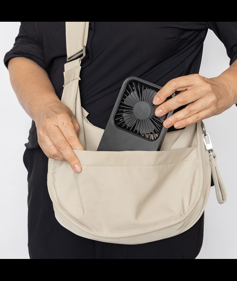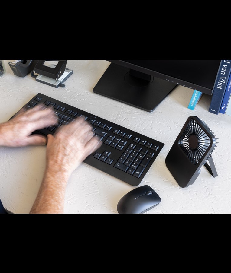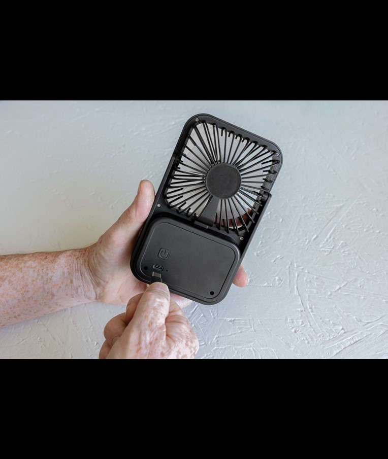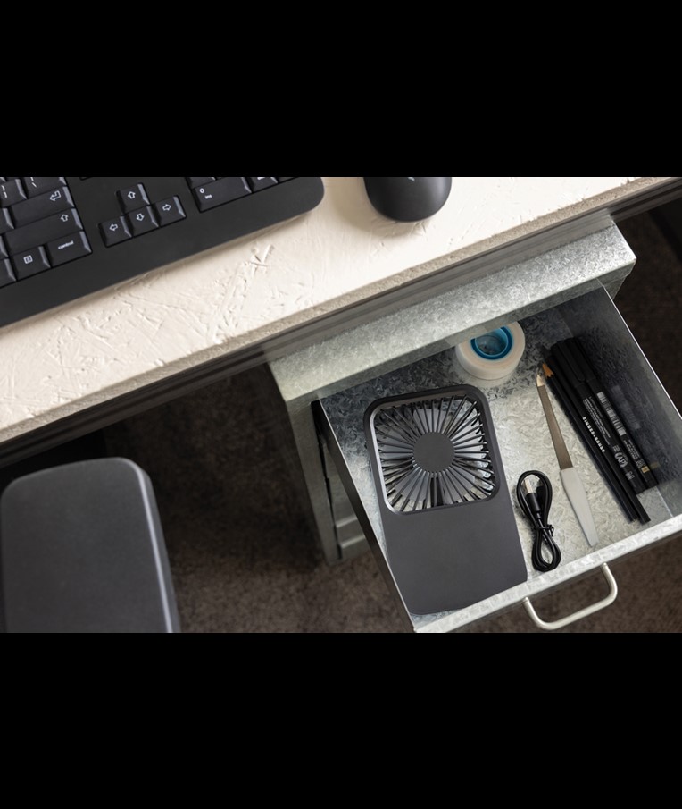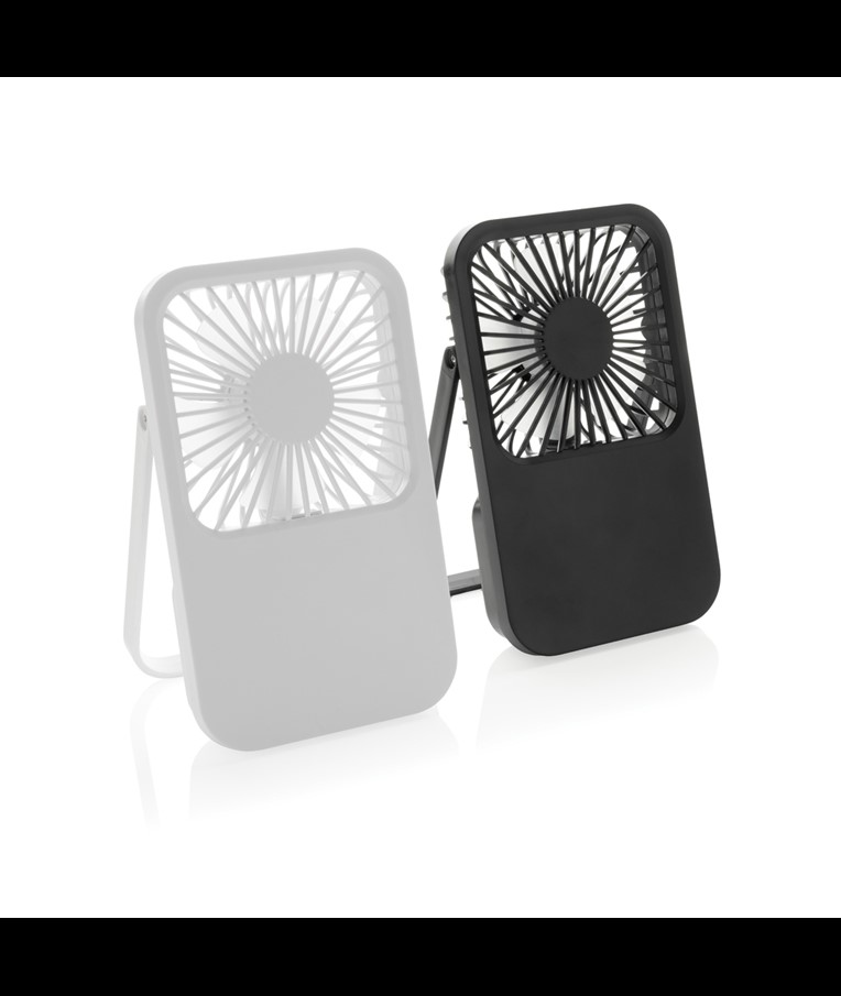 The Aervina desk fan, made from RCS certified recycled plastic, is a sleek and practical way to enjoy a refreshing breeze at home or in the office. Its modern black design combines style with function. The rechargeable 1200 mAh Li-ion battery provides up to 3 hours of working time and recharging in 4 hours via the included 120 cm black TPE USB-A to USB-C cable. With three adjustable speed levels and an adjustable stand, the Aervina fan offers flexible comfort wherever you need it. Made from RCS certified recycled ABS plastic. RCS (Recycled Claim Standard) is a standard to verify the recycled content of a product throughout the whole supply chain. Total recycled content: 58 % based on total item weight. This fan is PVC-free and packaged in an FSC® certified kraft box.Max. power: 5W | Input current: 5V / 400mA.