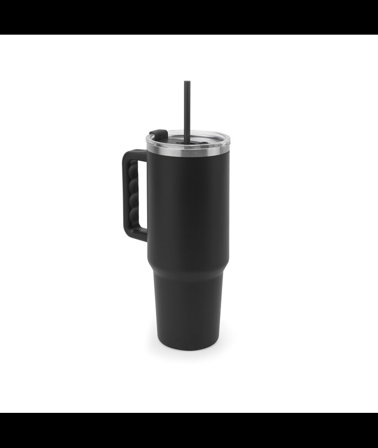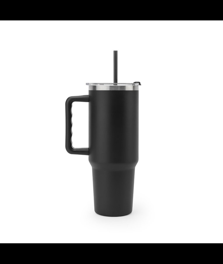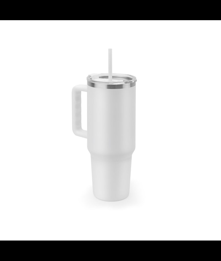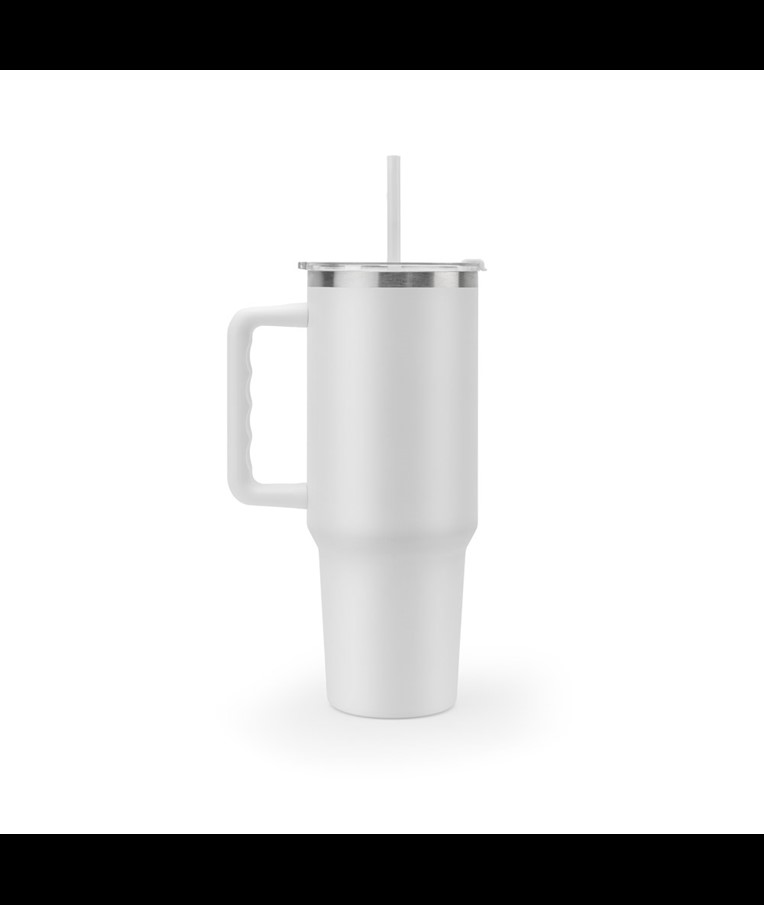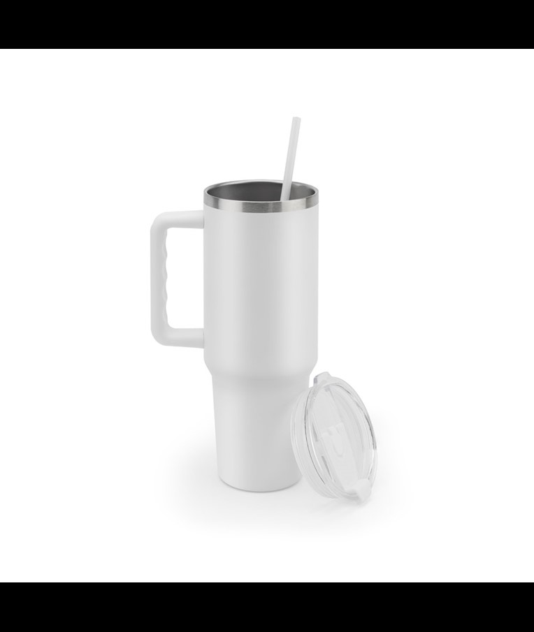 Large travel cup to keep you hydrated throughout the day without the need for constant refills. Made from stainless steel (91% rSS), it has a vacuum-insulated double wall and a matt finish. This cup can be used in two ways: through its straw opening or through the hole for direct use (it can be covered). Its handle makes it easy to carry, whether for work or outdoor activities. Capacity up to 1300 mL. Supplied in a kraft paper gift box. ø143 x 257 mm (without straw) | Straw: 305 mm