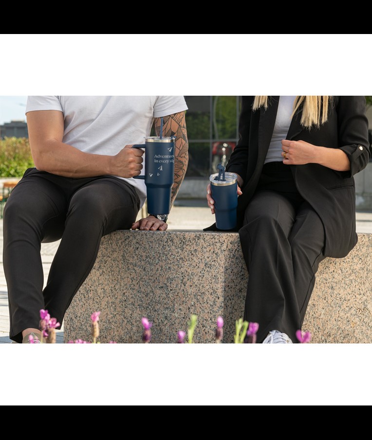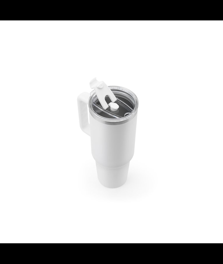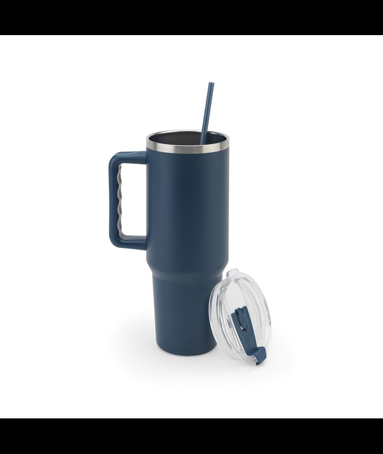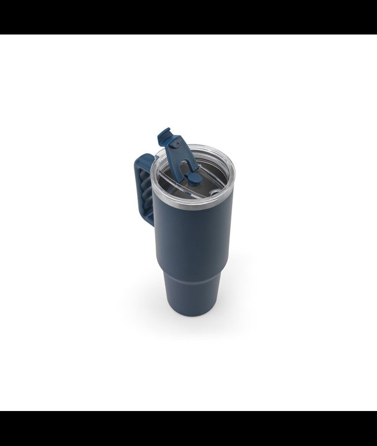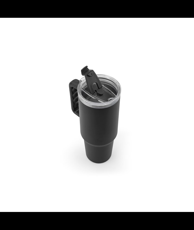 Large travel cup to keep you hydrated throughout the day without the need for constant refills. Made from stainless steel (91% rSS), it has a vacuum-insulated double wall and a matt finish. This cup can be used in two ways: through its straw opening or through the hole for direct use (it can be covered). Its handle makes it easy to carry, whether for work or outdoor activities. Capacity up to 1300 mL. Supplied in a kraft paper gift box. ø143 x 257 mm (without straw) | Straw: 305 mm