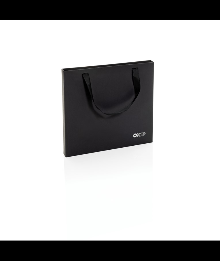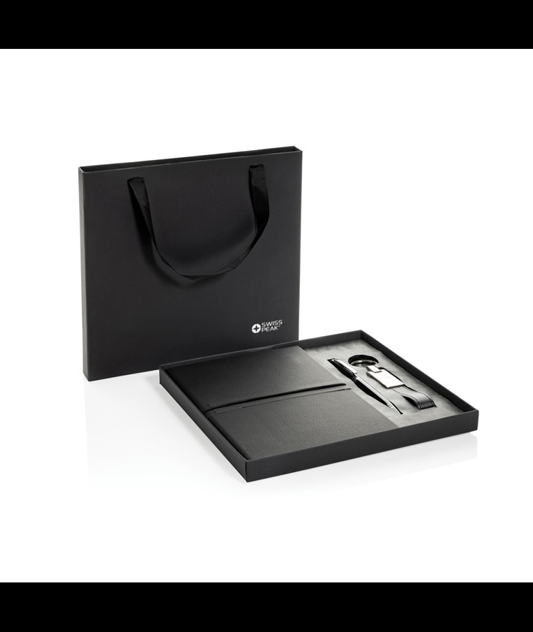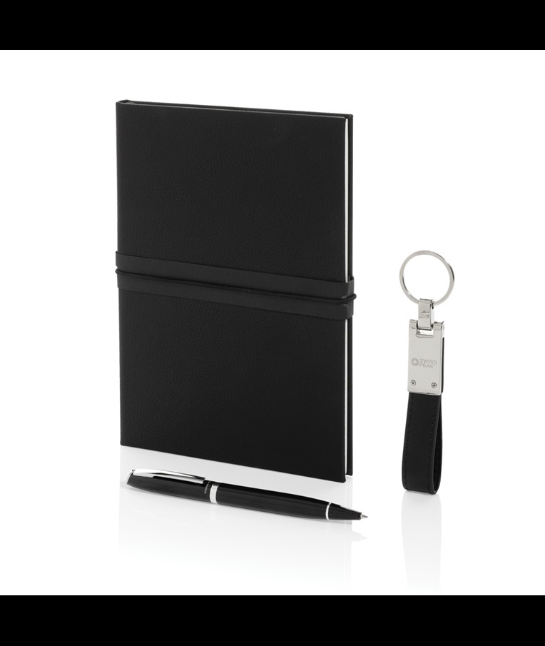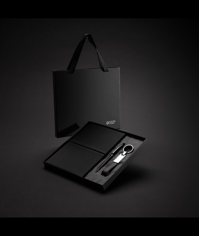 This luxury basic gift set includes the most necessary essentials you need in your daily routine. To keep your most important keys always within reach, the set includes a premium Swiss Peak keychain featuring a glossy metallic finish and a beautifully crafted PU leather strap.Need to jot down some thoughts or ideas? This set also comes with a sleek business ballpoint pen with a writing capacity of 1000 metres, and a soft-touch PU notebook made from recycled polyester. The notebook contains 160 cream-coloured pages made from recycled paper.All items in this gift set are RCS certified, guaranteeing a fully verified supply chain for the recycled materials used. In total, the products in this set consist of 75% recycled content.