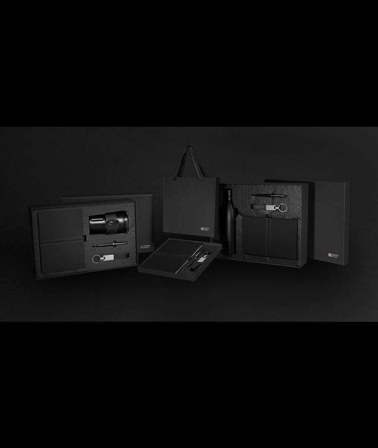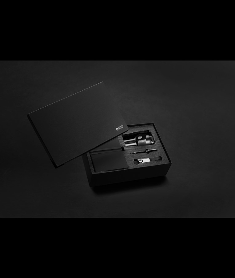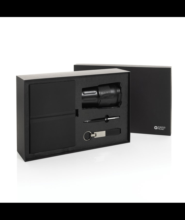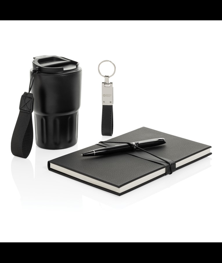 This luxury gift set includes all the essentials you need to get through your workday in style. The 350 ml double-walled tumbler is vacuum insulated, keeping your drink hot or cold for an extended period. The leak-proof lid ensures your clothes stay dry, even if the tumbler is accidentally tilted or not held upright.To keep your most important keys always within reach, the set includes a premium Swiss Peak keychain featuring a glossy metallic finish and a beautifully crafted PU leather strap.Need to jot down some thoughts or ideas? This set also comes with a sleek business ballpoint pen with a writing capacity of 1000 meters, and a soft-touch PU notebook made from recycled polyester. The notebook contains 160 cream-colored pages made from recycled paper.All items in this gift set are RCS certified, guaranteeing a fully verified supply chain for the recycled materials used. In total, the products in this set consist of 75% recycled content.