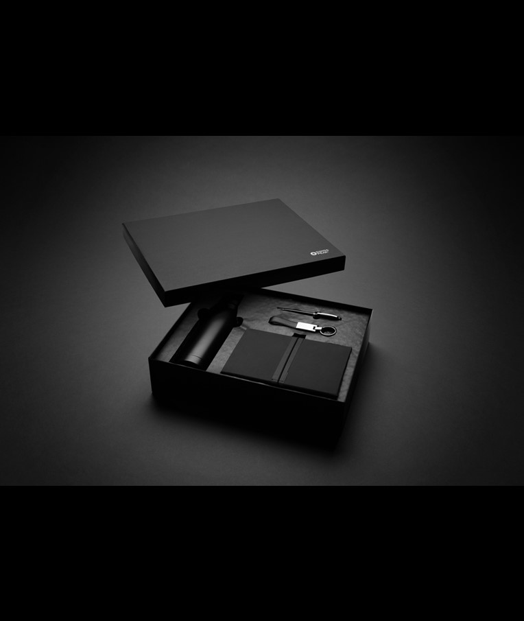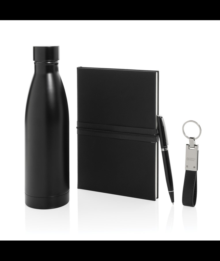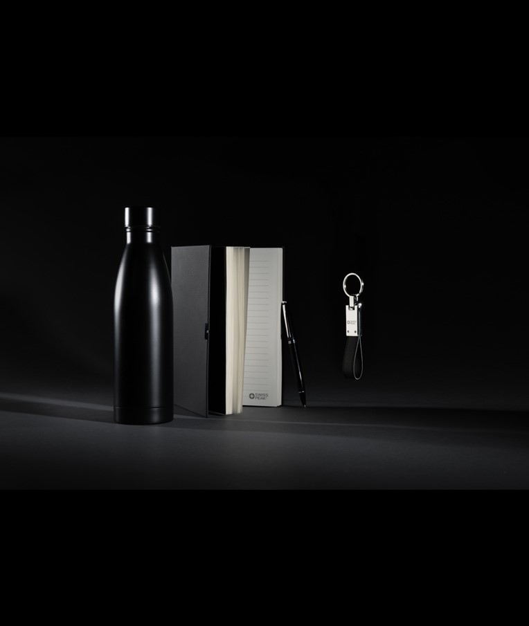 This luxury gift set includes all the essentials you need to get through your workday with comfort and style. The 480 ml double-walled water bottle is made from recycled stainless steel and features vacuum insulation to keep your drinks hot or cold for hours. Thanks to its leak-proof lid, you can carry it with confidence—no spills, no worries.To keep your most important keys always within reach, the set includes a premium Swiss Peak keychain with a glossy metallic finish and a beautifully crafted PU leather strap.Need to capture your ideas on the go? The set also includes a sleek business ballpoint pen with an 1000 metre writing capacity, paired with a soft-touch notebook made from recycled polyester PU. Inside, you'll find 160 cream-coloured pages made from recycled paper—perfect for jotting down notes, ideas, or to-do lists.All items are RCS certified, ensuring a fully verified supply chain for all recycled materials used.